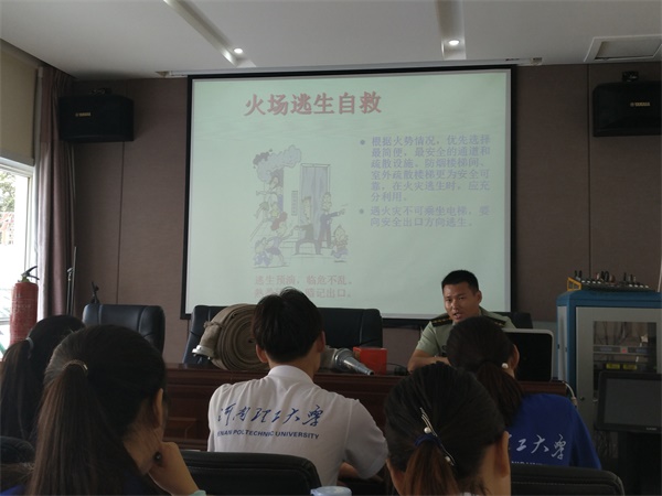 活动伊始,王中奎向宣讲团详细介绍了消防安全的相关知识,讲解了火灾形成的一些原因和灭火过程,并告诫大家在日常生活中一定要注意电器的使用、要注意易引起火灾的隐患。同时,他向宣讲团列举了近年来一些典型的火灾案例,强调了防范火灾的重要性。然后,向宣讲团展示了几种灭火方法及灭火器的分类和使用。他强调,灭火器的使用一定要结合火灾现场的情况,不能盲目使用灭火器,否则甚至会加重火灾事故。而这些都是宣讲团同学需要重点学习的。逃生自救方法:毛巾捂鼻法、厚物护身法、结绳自救法…这些方法都在紧急时刻增加大家的求生希望。对于同学们提出的提问,王中奎一一详细又耐心的给出了解答。