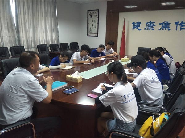 “学·行·践”国家安全观暑期社会实践第一站,同学们来到焦作市卫计委应急办进行参观学习调研,宣讲团同学特地到焦作市人民政府,与卫计委应急办主任赵金平举行了一次座谈会。
