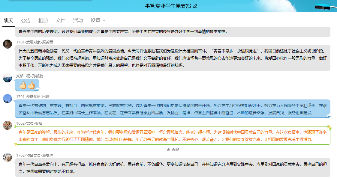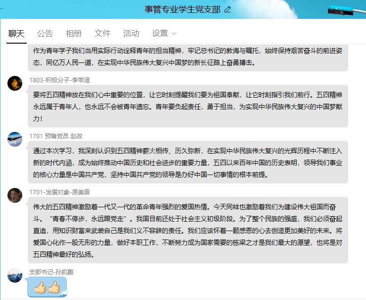 “青年是民族的未来。”事管17-2班田帅佳说,“我们青年要将自己的人生理想与实现中华民族伟大复兴的中国梦结合起来,才能发挥自己最大的光芒。”事管18-3班的邓立军说,“我们要用奋斗绘制自己的青春宏图,用汗水浇灌自己的青春之花,努力争做爱党、爱国、爱民、爱自己的新时代青年。”