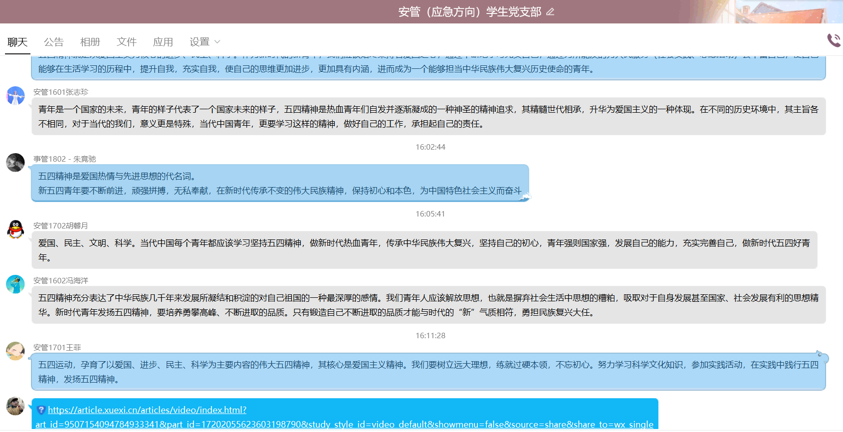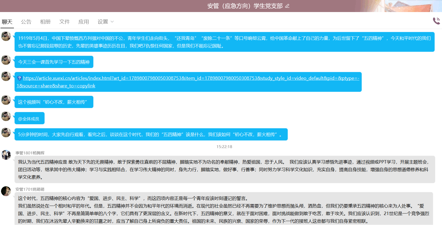 随后全体成员一起观看了《初心不改 薪火相传》和《“平”语近人——习近平总书记用典》视频,并结合视频内容,围绕新时代的五四精神、争做奋进青年、建功新时代展开了热烈的讨论。同学们纷纷表示,习近平总书记对新时代青年的寄语鼓舞斗志、激励人心,通过学习往昔知识分子的五四精神,能更好地启蒙当下,更加了解伟大的精神代代相传、伟大的事业接续奋斗的使命与责任。