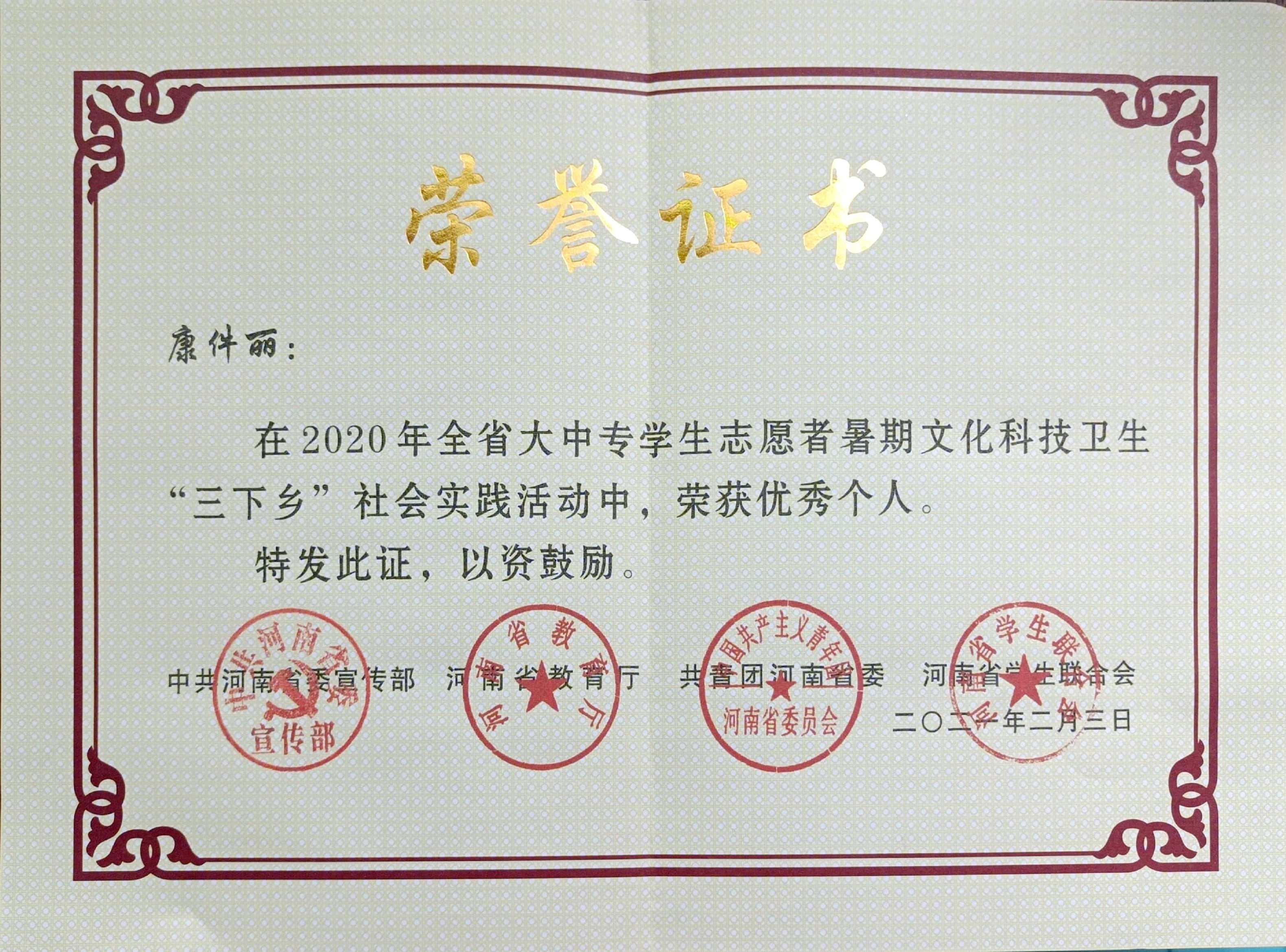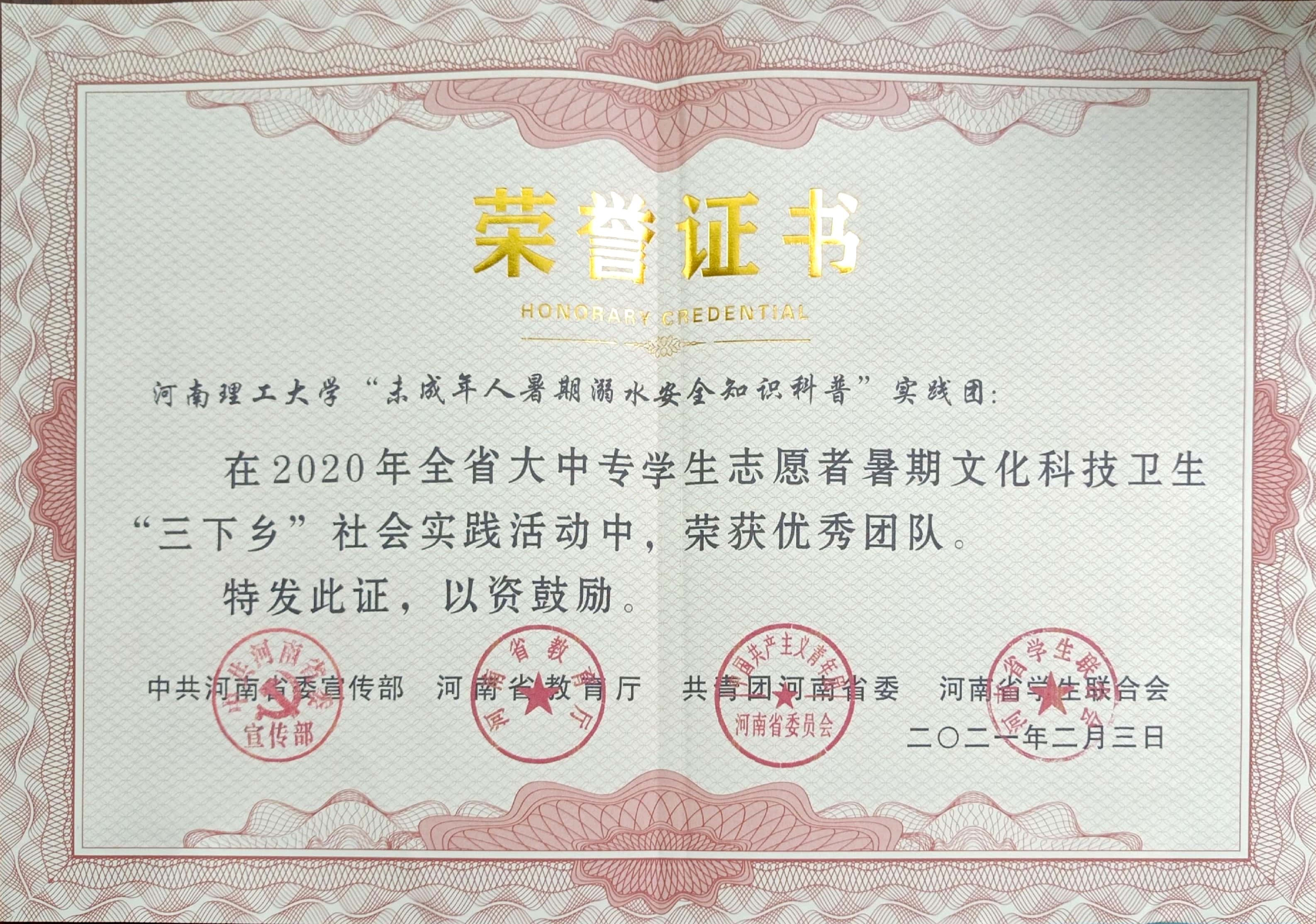 近日,中共河南省委宣传部、河南省教育厅、共青团河南省委和河南省员工联合会联合发文《关于2020年全省大中专员工志愿者暑期文化科技卫生“三下乡”社会实践活动的通报》,太阳成集团tyc33455cc“未成年人暑期溺水安全知识科普”实践团荣获优秀团队称号,团队指导老师康件丽荣获“2020年全省暑期‘三下乡’社会实践活动“优秀个人”称号。