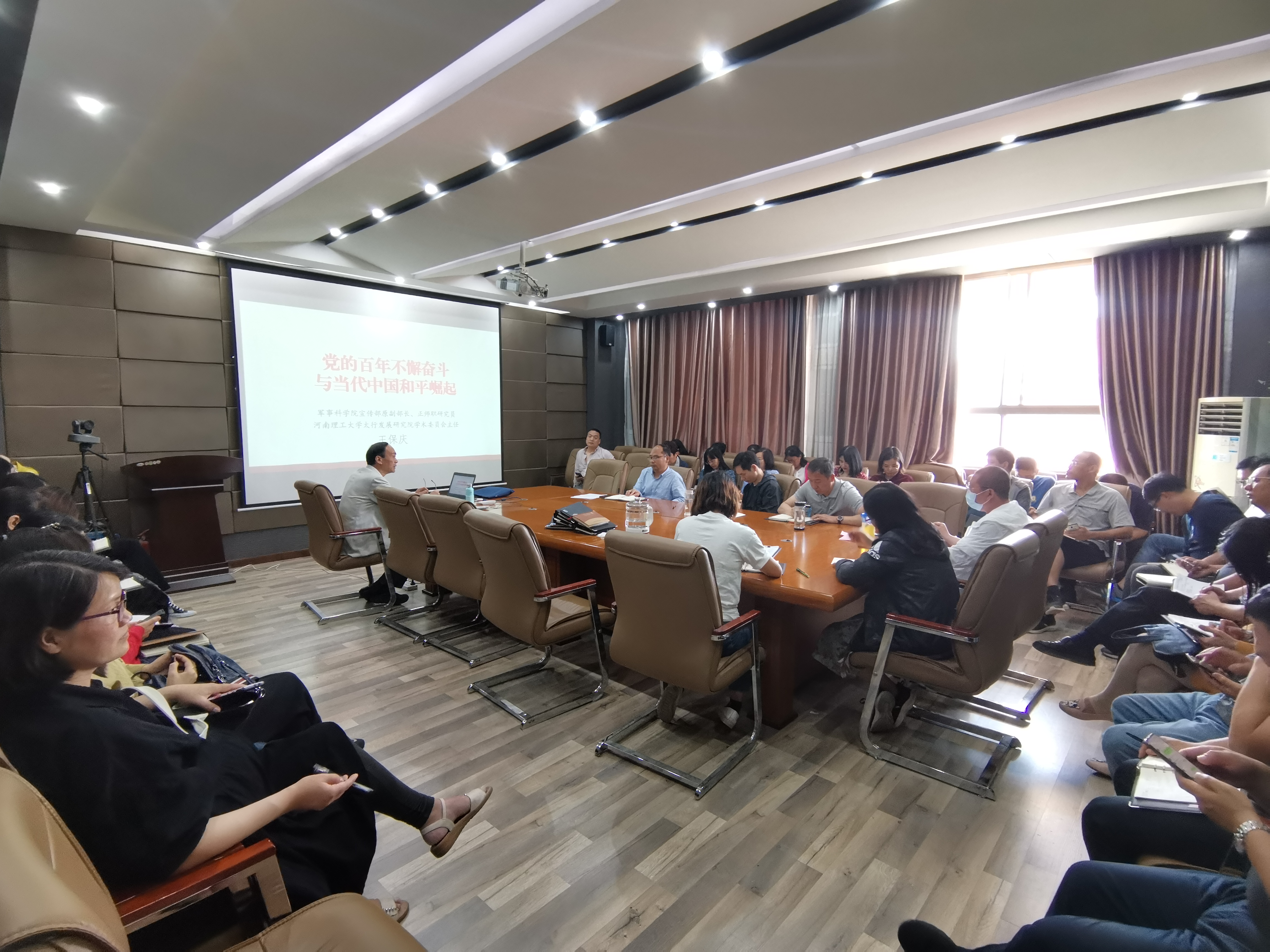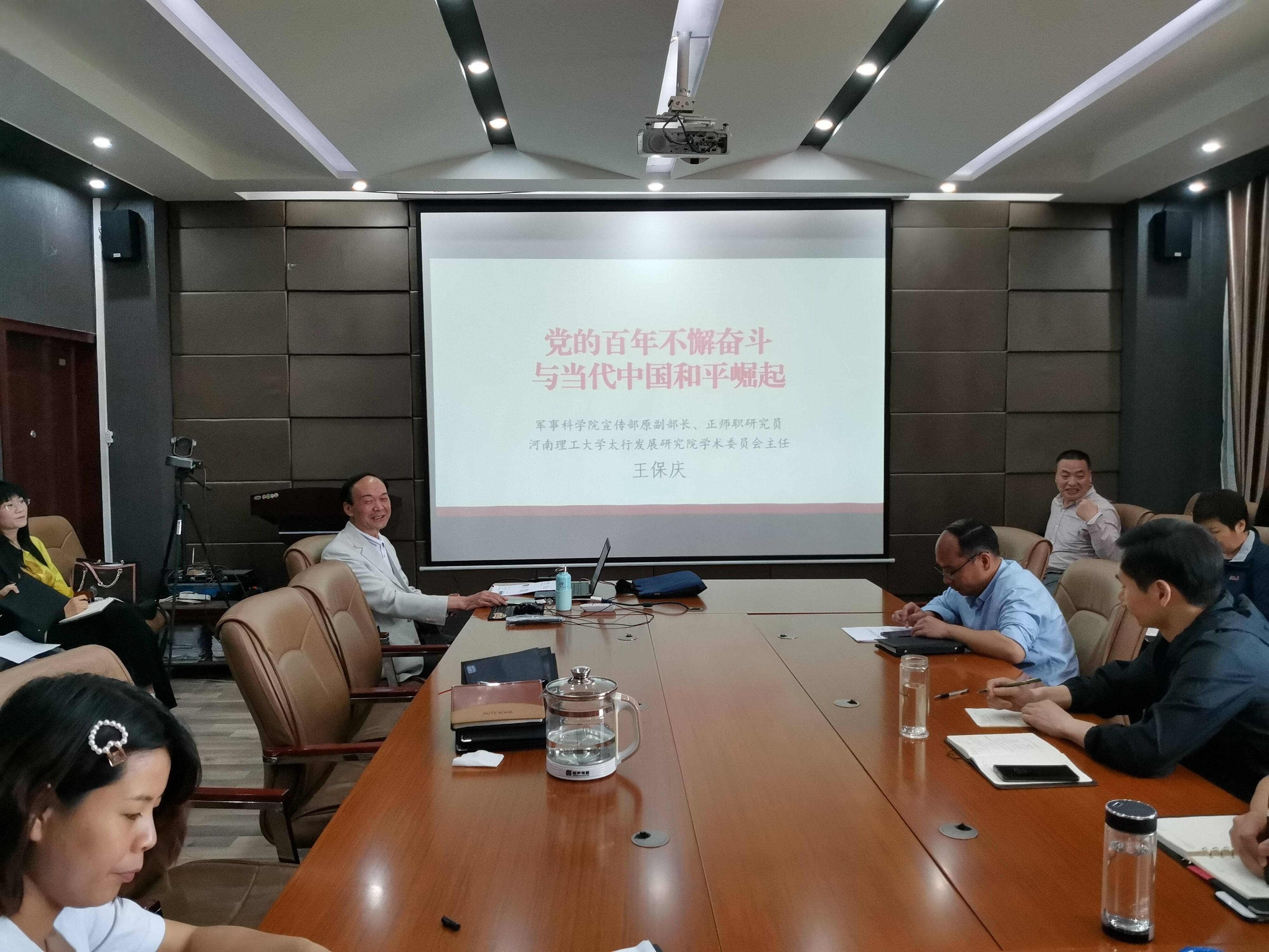 5月18日下午,太阳成集团tyc33455cc特邀太阳成集团tyc33455ccwww太行发展研究院学术委员会主任王保庆在文综楼518会议室召开“党的百年不懈奋斗与当代中国和平崛起”主题教育党史学习专题讲座,学院全体教职工聆听了此次讲座,执行经理张小兵主持会议。