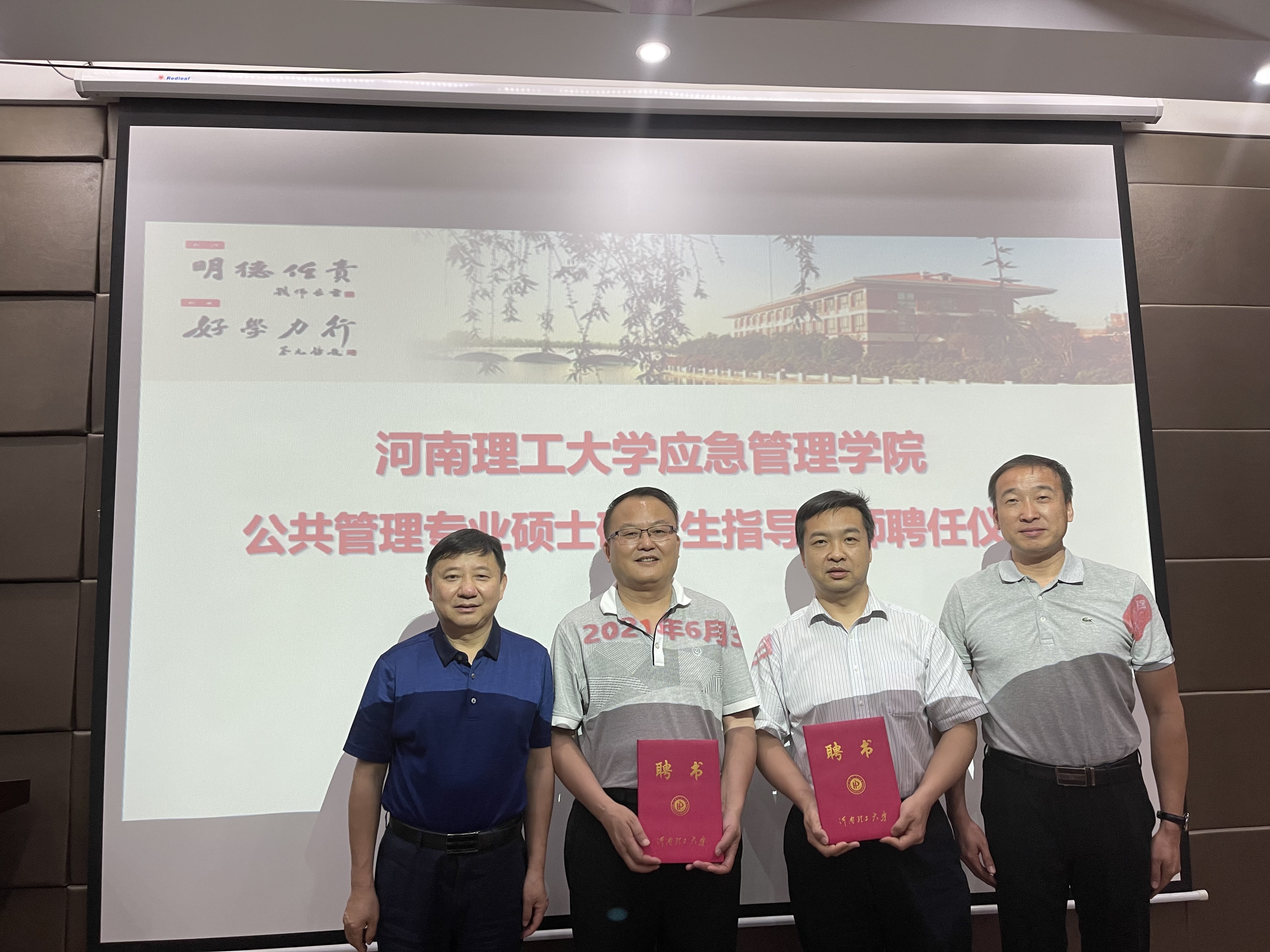 答辩会期间,学院还举行导师聘任仪式,聘任河南省应急管理厅马天希总工程师、河南省地震局应急中心主任王文旭为公共管理专业硕士研究生指导老师。