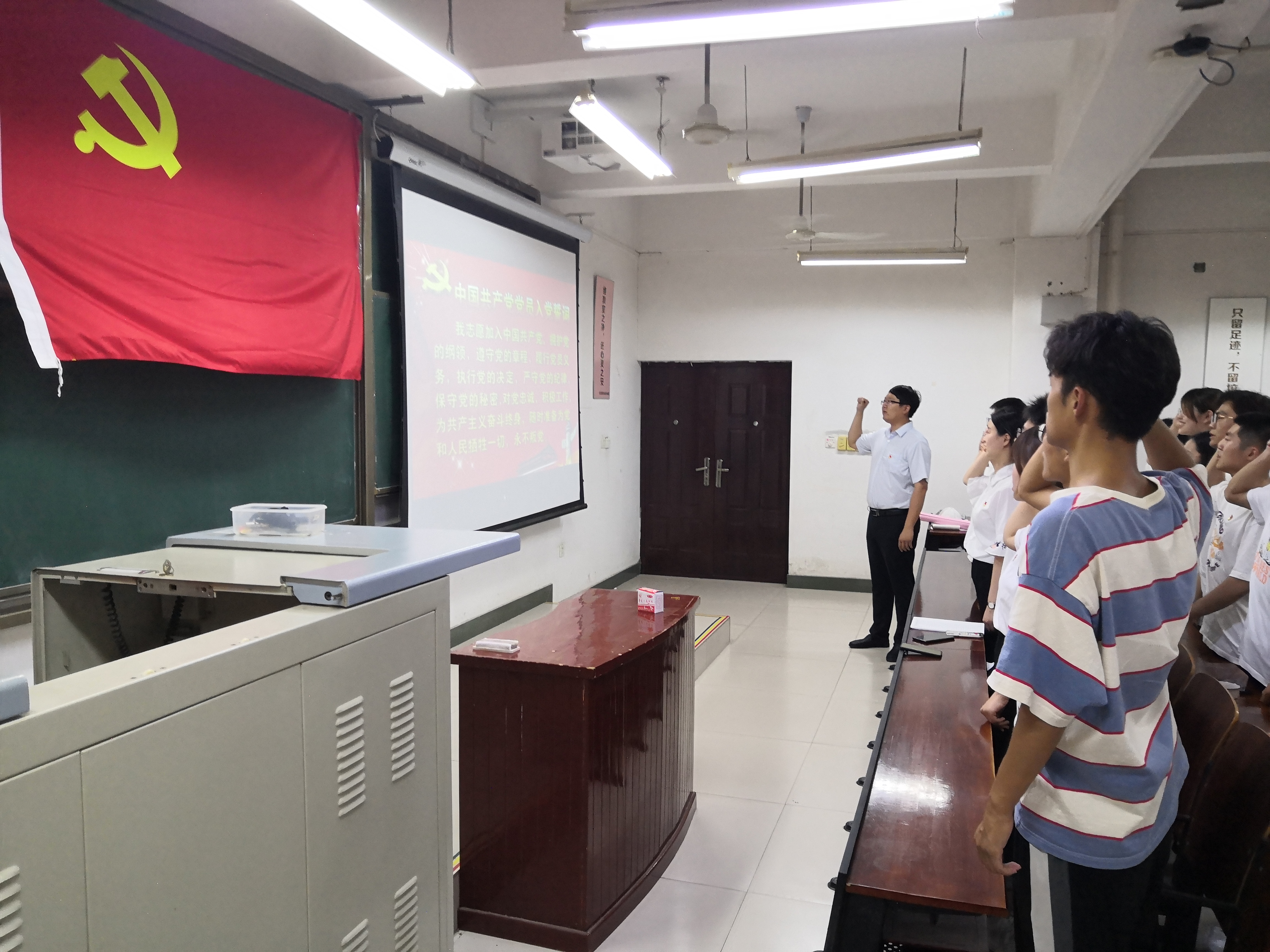 活动伊始,孙凯鹏详细讲解了宣誓人宣誓过程中需要注意的事项:时刻保持身体挺直、肃立,右手握拳举起来与右耳齐行,声音洪亮、感情饱满、慷慨激昂。宣誓过程中,党员代表们高举右手,面向鲜红的党旗庄严宣誓,铿锵有力的宣誓声中展现了对党的忠诚和为共产主义事业奋斗终身的决心和承诺。最后,老师指出,入党宣誓象征着党员政治生命的开启,希望党员们进一步坚定理想信念,不断增强政治定力,牢记今天立下的铮铮誓言,在关键时刻靠得住、信得过,自觉做共产主义远大理想和中国特色社会主义共同理想的坚定信仰者和忠实实践者