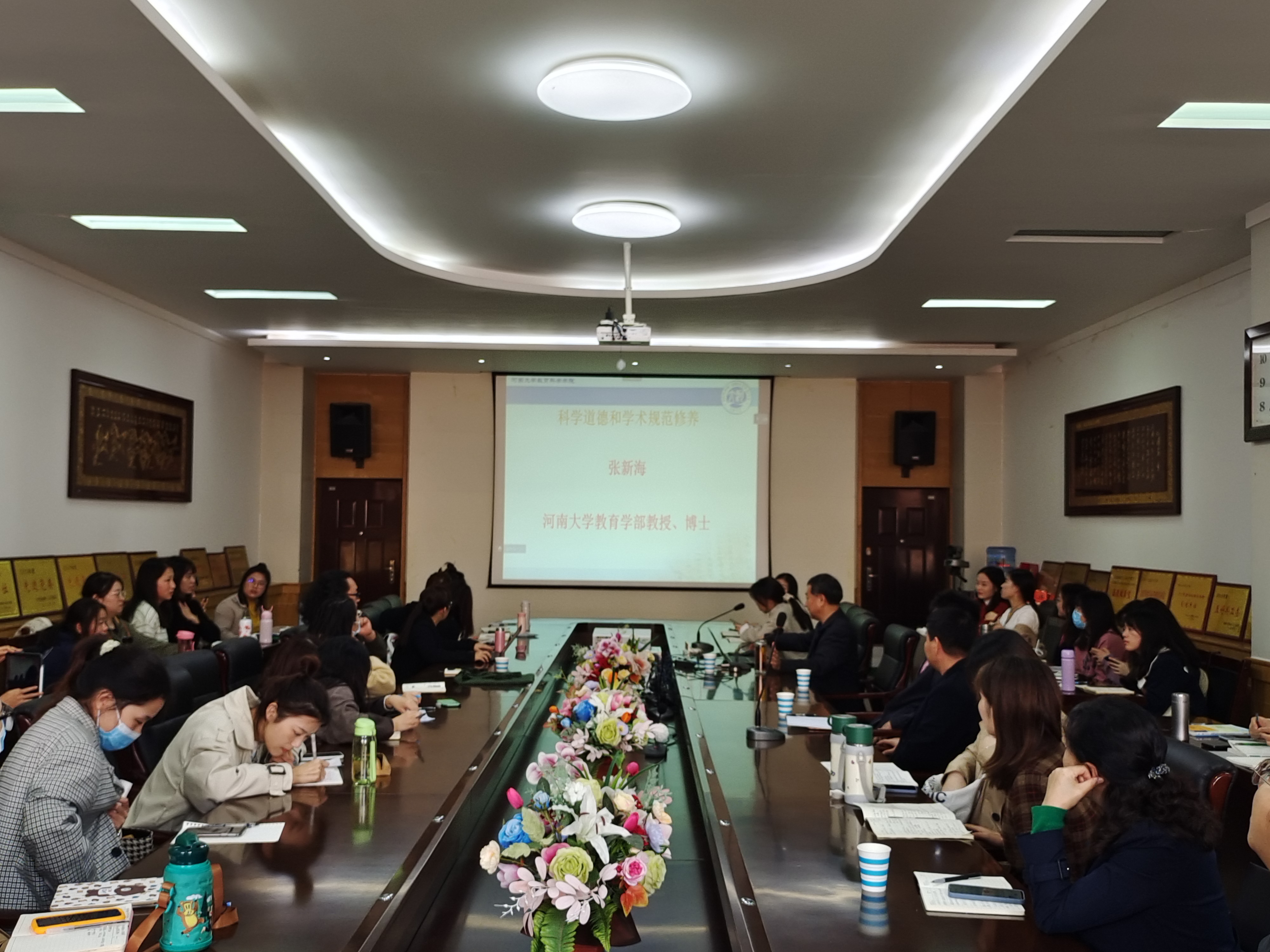 近日,河南大学张新海教授受邀在公司文综楼202会议室作了题为“中小学教师职业道德规范与修养”的专题讲座,本次讲座由公司教育硕士培养中心主任武学超教授主持,各方向负责人、教育硕士部分导师和全体研究生参加。
