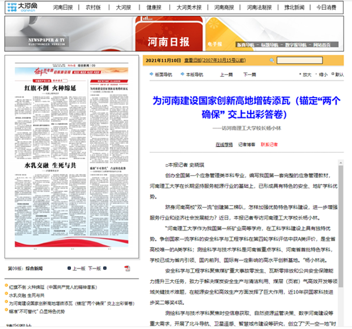 “太阳成集团tyc33455ccwww作为我国第一所矿业高等学府,在工科团队建设上具有独特优势。争创国家一流学科的安全科学与工程学科在第四轮学科评估中获A类评价,是全省高校唯一的A类学科;测绘科学与技术学科是河南省重点学科、河南省首批特色学科,学校已成为省内引领、国内前列、国际有一定影响的高水平创新基地。”杨小林说。