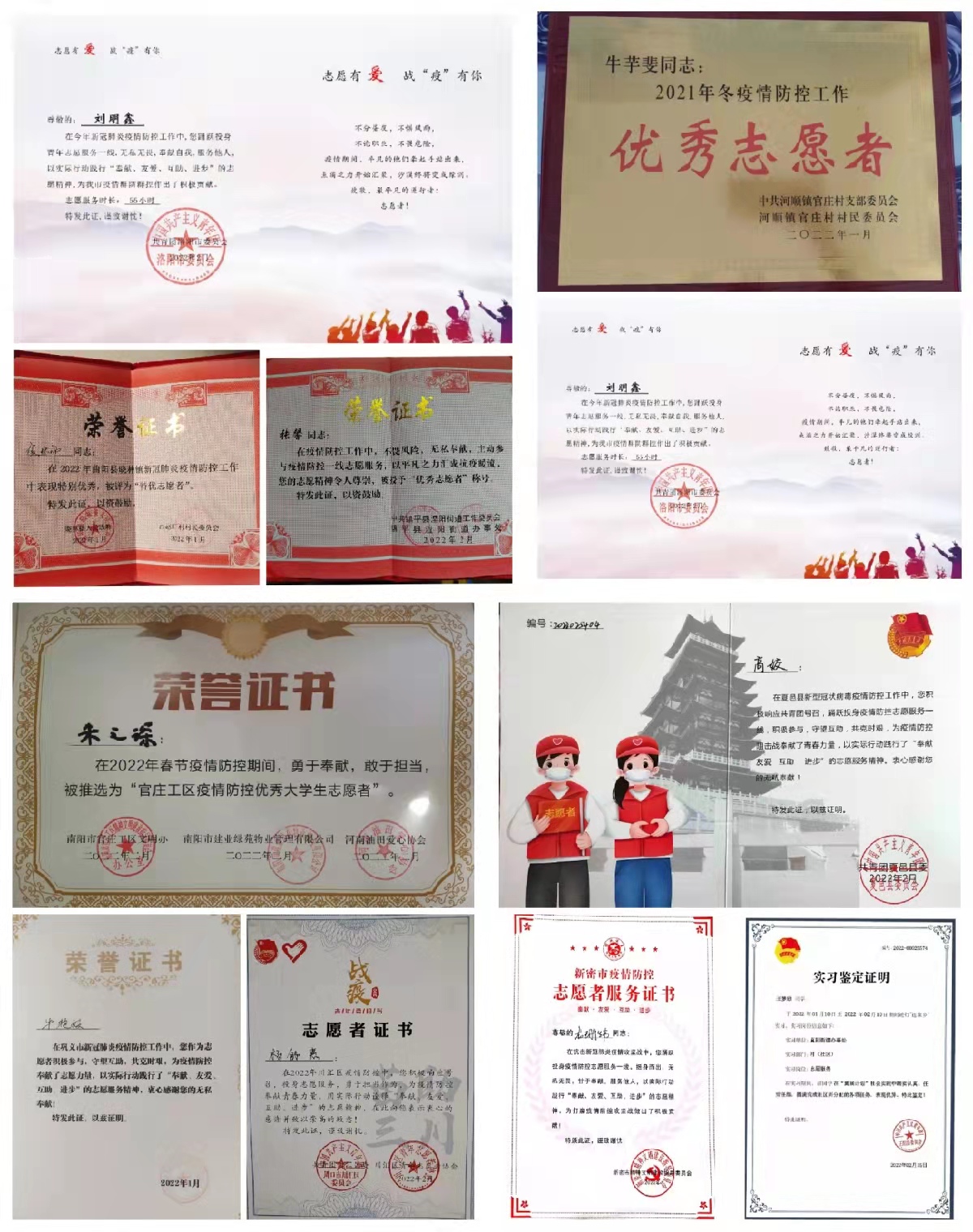 寒假期间,该院员工积极响应号召,主动参与到家乡疫情防控志愿服务队伍中,协助当地工作人员有序推进防疫工作。志愿服务期间,同学们挺身而出、不辞辛苦,义无反顾地投身防控一线,秉持着认真严谨、真诚负责的服务态度,始终以饱满的热情坚守在疫情防控服务卡点,积极宣传防疫知识,参与消杀防疫工作,为家乡防疫工作做出了积极贡献,以实际行动践行了新时代老员工敢于担当、服务社会、无私奉献的优秀品质,彰显了奉献、友爱、互助、进步的志愿精神。