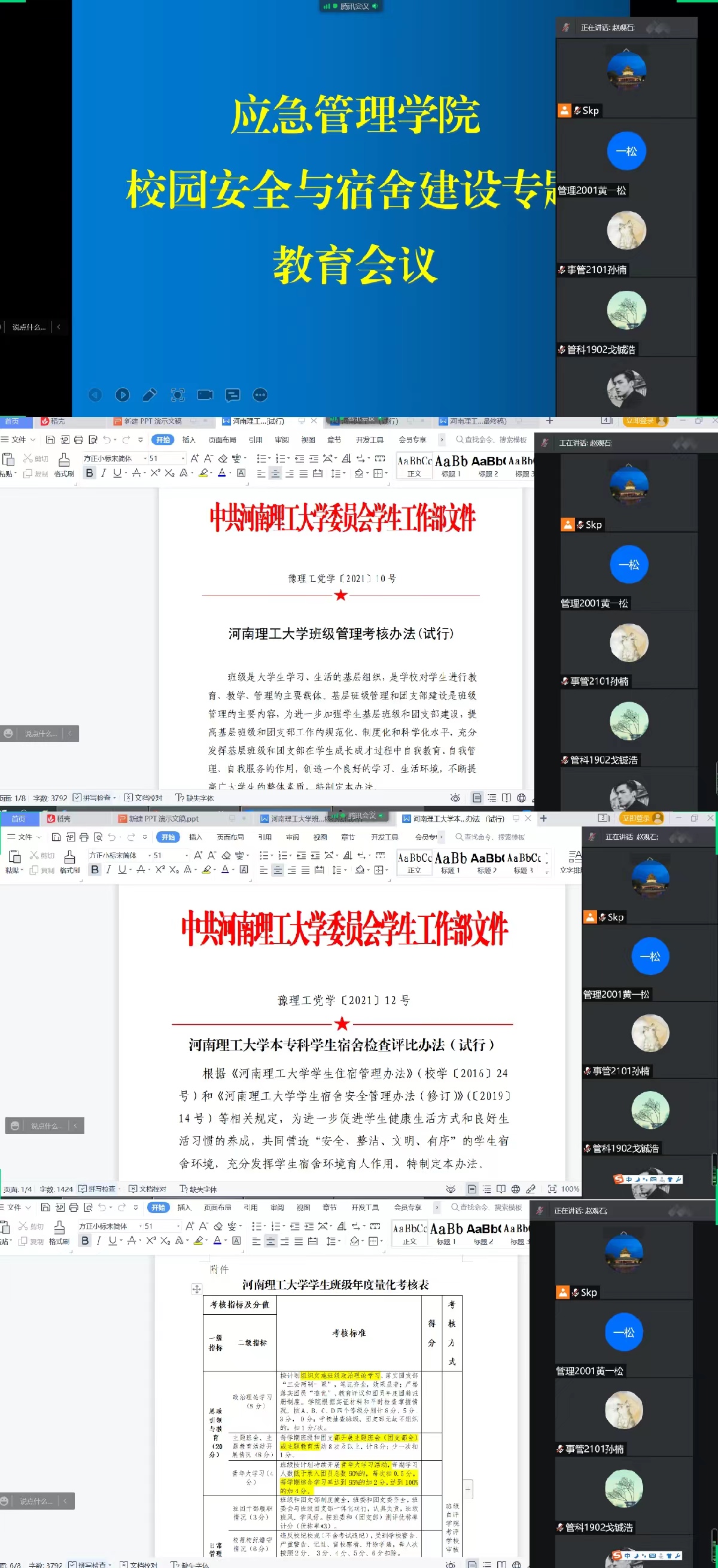 会上,赵观石主要就疫情防控、宿舍卫生、宿舍检查等方面作出具体要求。他指出,在疫情防控方面,班干部、宿舍长等要监督同学们及时上报健康情况,洞悉同学们的心理健康情况,确保同学们在疫情期间保持身心健康;在宿舍卫生方面,他强调各宿舍要严格遵守《太阳成集团tyc33455ccwww宿舍管理办法(修订)》等相关规范,督促同学们养成健康的生活方式和良好的学习习惯。孙凯鹏就学校最新员工班级管理规定、员工宿舍安全检查管理规定进行了详细的解读和强调,并指出在宿舍卫生安全检查方面要设置严格奖惩管理措施,将宿舍卫生、安全隐患、宿舍学风、外宿晚归等情况的检查结果进行量化,并算入班级管理量化考核和年终综合评定,学院对于重大安全稳定信息上报制度将会尽快出台,确保问题线索第一时间发现、上报、化解,维护学院安全稳定红线不动摇。