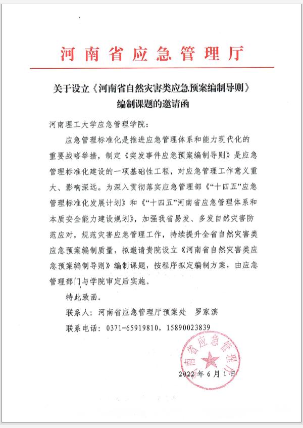 为深入贯彻落实应急管理部《“十四五”应急管理标准化发展计划》和《“十四五”河南省应急管理体系和本质安全能力建设规划》,加强我省易发、多发自然灾害防范应对,规范灾害应急管理工作,持续提升我省自然灾害类应急预案编制质量,公司程书波副教授及其科研团队受河南省应急管理厅邀请,编制《河南省自然灾害类应急预案编制导则》,成果将作为河南省地方标准实施,并择机推荐为国家标准。