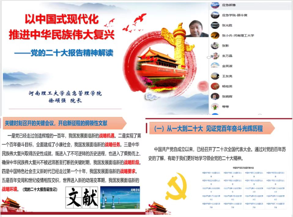 张光胜书记总结指出:“该场专题报告主题鲜明、逻辑清晰、阐释全面,对全院教工深刻领会党的二十大精神的核心要义,坚定理想信念,提升自身思想境界,明确学院发展新阶段的任务和要求等具有重要的理论意义和现实意义。学院教工要踔厉奋发、团结奋进、勇于担当、真抓实干,把握中国式现代化应急管理事业发展大势,为加快推进学院各项事业高质量发展贡献力量”。学院教工纷纷表示,要进一步全面深入学习党的二十大精神,学用结合,担当作为,努力投身到公司党建、教学、科研、育人等工作中,争取在学院新发展阶段取得更大成绩。