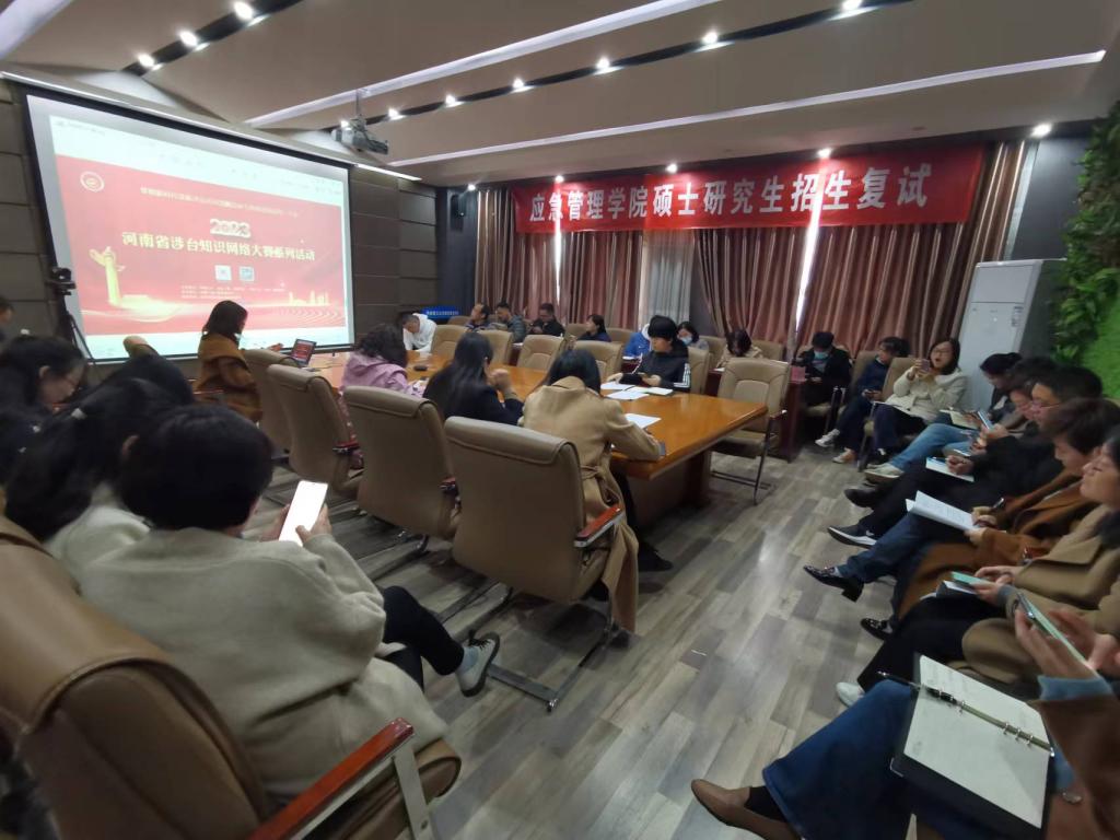 为进一步深入学习宣传贯彻党的二十大精神,扎实做好学习宣传二十大精神和涉台宣传教育工作,4月4日,太阳成集团tyc33455cc在文综楼518会议室开展“2023年河南省涉台知识网络大赛”答题活动,副经理任华主持,全体教职工参与答题。