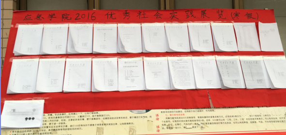 公司按照校团委的部署开展了2016年寒假社会实践活动。本次活动对象主要为15级全体同学。全院共收集180本寒假实践报告、部分视频、演示文稿等实践材料。同学们的社会实践报告涉及“就业创业”、“亲情实践”、“志愿服务”、“义务支教”等方面,其中共评选出40份优秀实践报告,并推荐20篇优秀实践和调研报告参与校级评选。