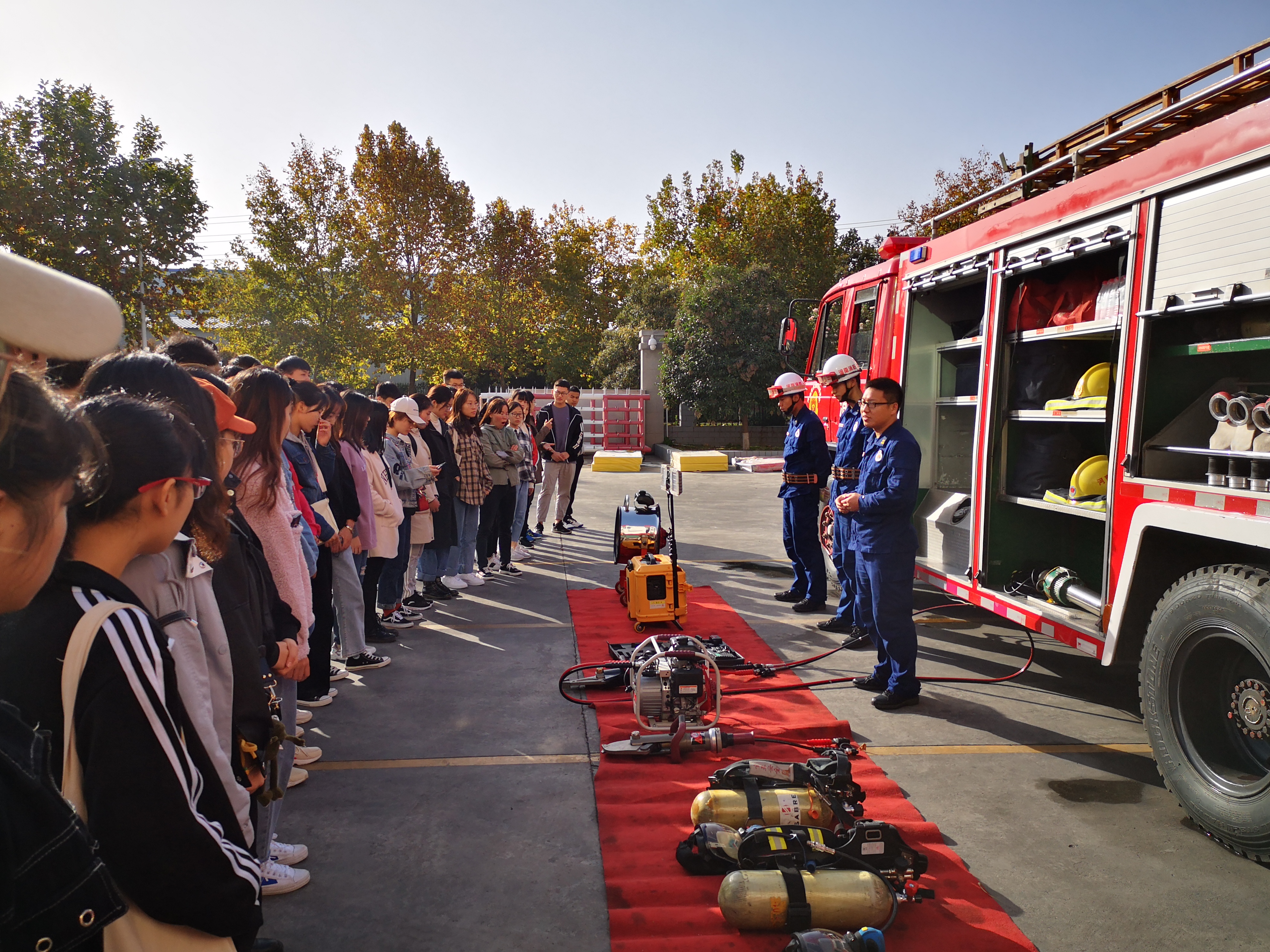 首先,由消防员为我们展示了一些在应急救援活动中常用到的救援器材, 在消防员的指导下,同学们积极认真地学习了空气呼吸仪的使用以及消防服的快速穿戴方法。之后,由消防员为我们一一介绍了队里各种类型的消防车及其用途。现场学习参与氛围很强,同学们都积极地向消防员提出了自己的疑问并实际操作了部分器材,获得了很大的收获。