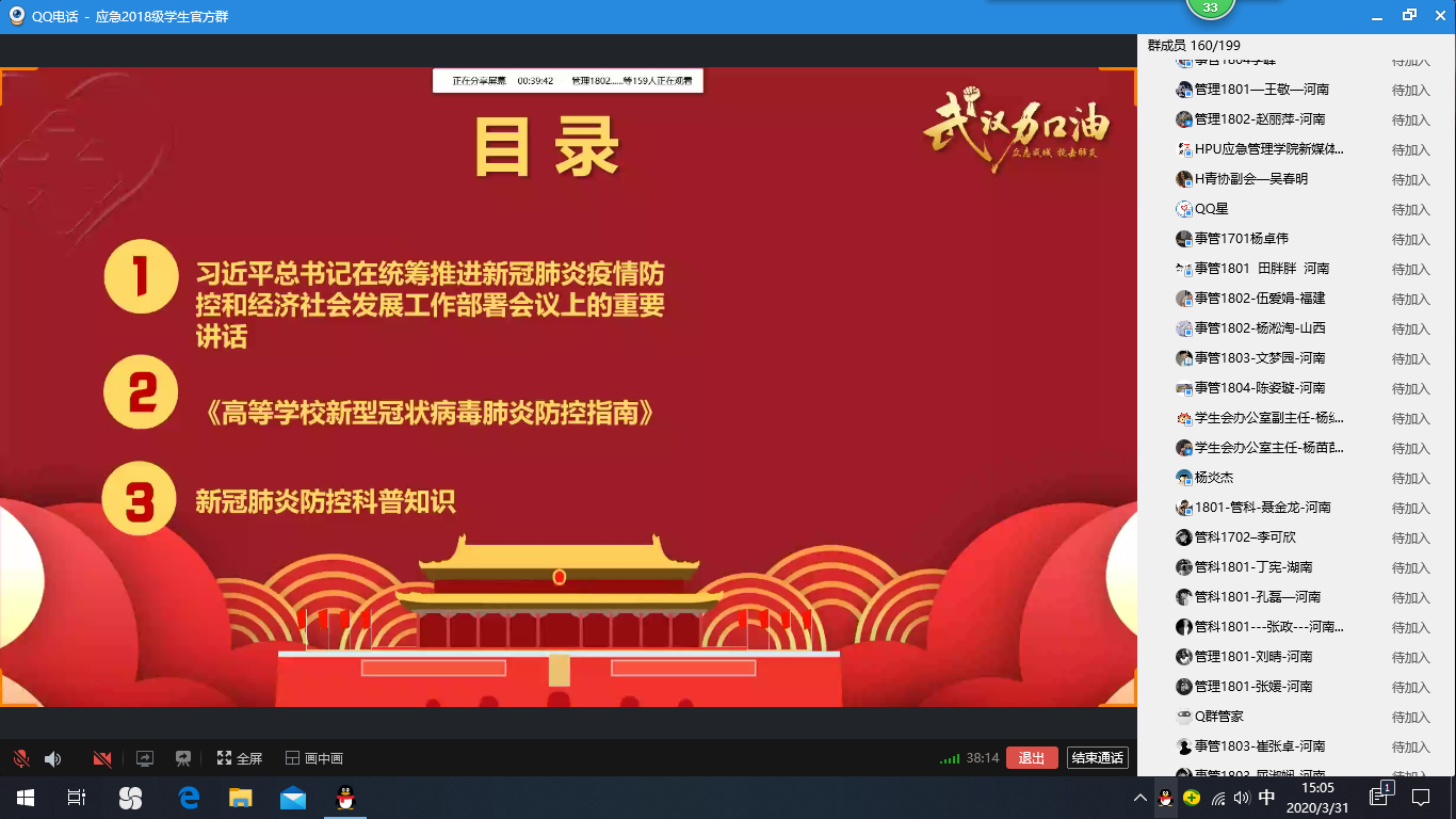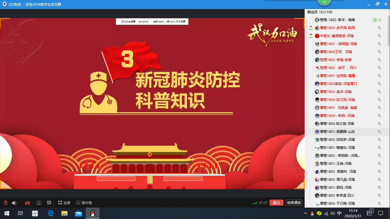 会上,管科1802班团支书寇佳诣向同学们传达并深刻解析了习近平总书记在统筹推进新冠肺炎疫情防控和经济社会发展工作部署会议上的重要讲话,引导同学们充分了解以习近平同志为核心的党中央为做好疫情防控工作所采取的重重大决策和政策措施,进一步引导大家客观理性看待当前疫情形势。紧接着,管科1802班李洋同学引领同学们认真学习了《高等学校新型冠状病毒肺炎防控指南》宣传手册,他重点普及了员工、家长、辅导员、学校等不同主体防控措施的相关知识,以及开学前、返校时、入校后等不同时间段的防控举措。最后,为做好疫情防控科普工作,管科1802班王喜龙同学重点讲解了“什么是新冠病毒”,使同学们了解了新冠病毒基本特点、潜伏期及症状、传播途径和方式等,帮助公司员工提升科学素养,加强对健康理念和传染病防控知识的宣传教育,在防控措施中他重点介绍了洗手和戴口罩的重要性。会议结束后,同学们在学习群里积极讨论,纷纷表示对国家、学校的防控措施十分充满信心,相信疫情防控的阻击战必将胜利。