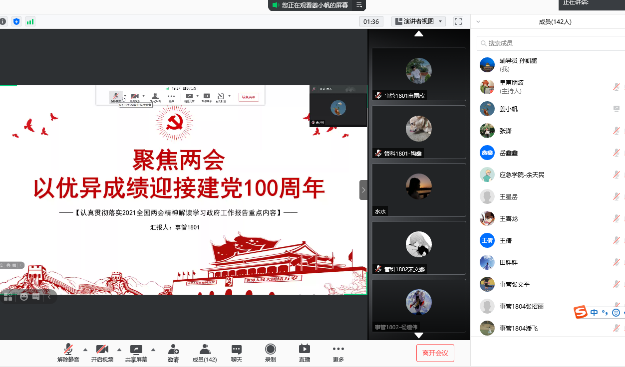 会上,各年级辅导员老师、班级干部做“习近平在2021两会期间重要讲话精神”“2021年《政府工作报告》主题宣讲。会议强调,中国发展进入新时期,作为青年老员工,要高举中国特色社会主义伟大旗帜,以习近平新时代中国特色社会主义思想为指导,齐心协力,开拓进取,努力完成全年目标任务,以优异成绩庆祝中国共产党百年华诞,为把我国建设成为富强民主文明和谐美丽的社会主义现代化强国、实现中华民族伟大复兴的中国梦不懈奋斗。