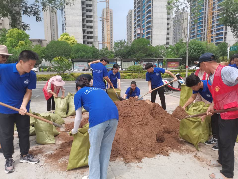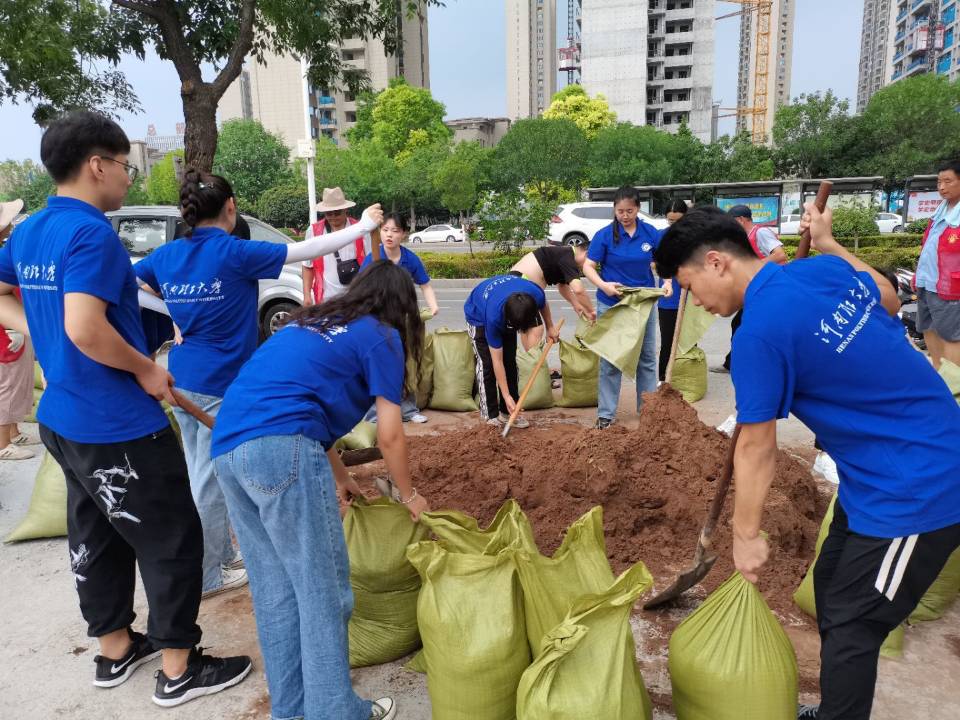 团队成员在南李万村社区偶遇志愿者装填沙袋,队长任少通前去了解到由于近日焦作受持续性强降雨影响,多个村庄发生洪涝灾害,南李万村地势低洼,易发积水现象,存在安全隐患。为提前做好防护准备,南李万村委会人员及社区志愿者于村口搭建防洪沙袋堤坝。此时天气恶劣,随时存在下暴雨的可能,看到南李万村志愿者辛勤、匆忙的背影,任少通提议帮助村民装填沙袋、搭建堤坝,团队成员纷纷表示赞同。紧接着宣讲团成员齐心协力、团结协作,一人撑袋、一人铲沙,一人封口装订沙袋,一次次弯腰将沙袋固定压实,短短四十分钟,装填沙袋近90袋,人防工程防洪墙搭建工作全面完成。南李万村委会委员范红彦表示,宣讲团善意的举动,温暖了我们,传递了爱心。事后,范红彦代表全体村民向宣讲团成员送来感谢信,赞扬了理工学子为群众办实事的热心举动和为人民服务的精神风范。
