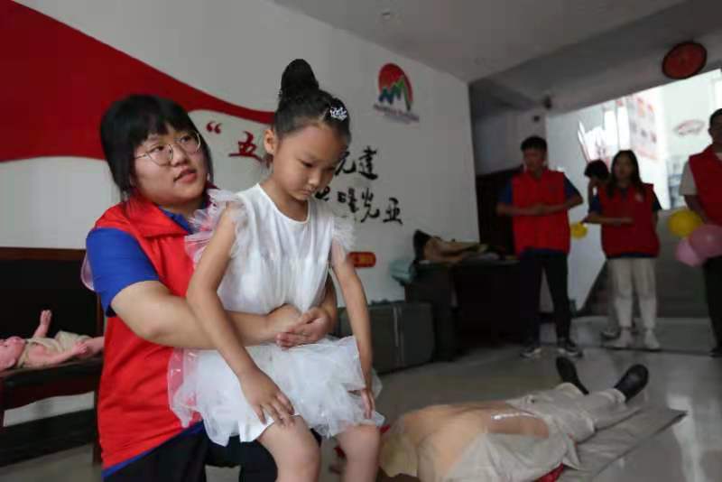 活动伊始,协助佑童志愿者鼓励青少年敞开心扉,了解接纳同伴,并组织青少年做众人划桨我开船等游戏,对青少年进行心理干预,帮助受灾群众和青少年走出心理雾霾。同时,宣讲团成员在宣讲场地做好准备,等待青少年和社区居民的到来。在心理干预结束后,宣讲团成员任少通向大家讲解心肺复苏的流程,并通过郑州暴雨中,一医生跪地六小时,救助十余人的真实案例,进一步说明心肺复苏的重要性。现场群众利用模拟人进行实操演练,由于居民普遍存在胸外按压时胳膊弯曲问题,任少通对心肺复苏的正确姿势再一次讲解。随后,桑芳茹普及海姆立克急救法,介绍如何判断气道梗阻,并向大家讲解适用于婴儿和儿童的海姆立克法。最后,王旭和谢鹏演示适用于成人的气道堵塞急救法,借助“石头剪刀布”帮助群众记忆,他们鼓励现场群众两两结合、实地操作,感受向内向上的冲击作用。