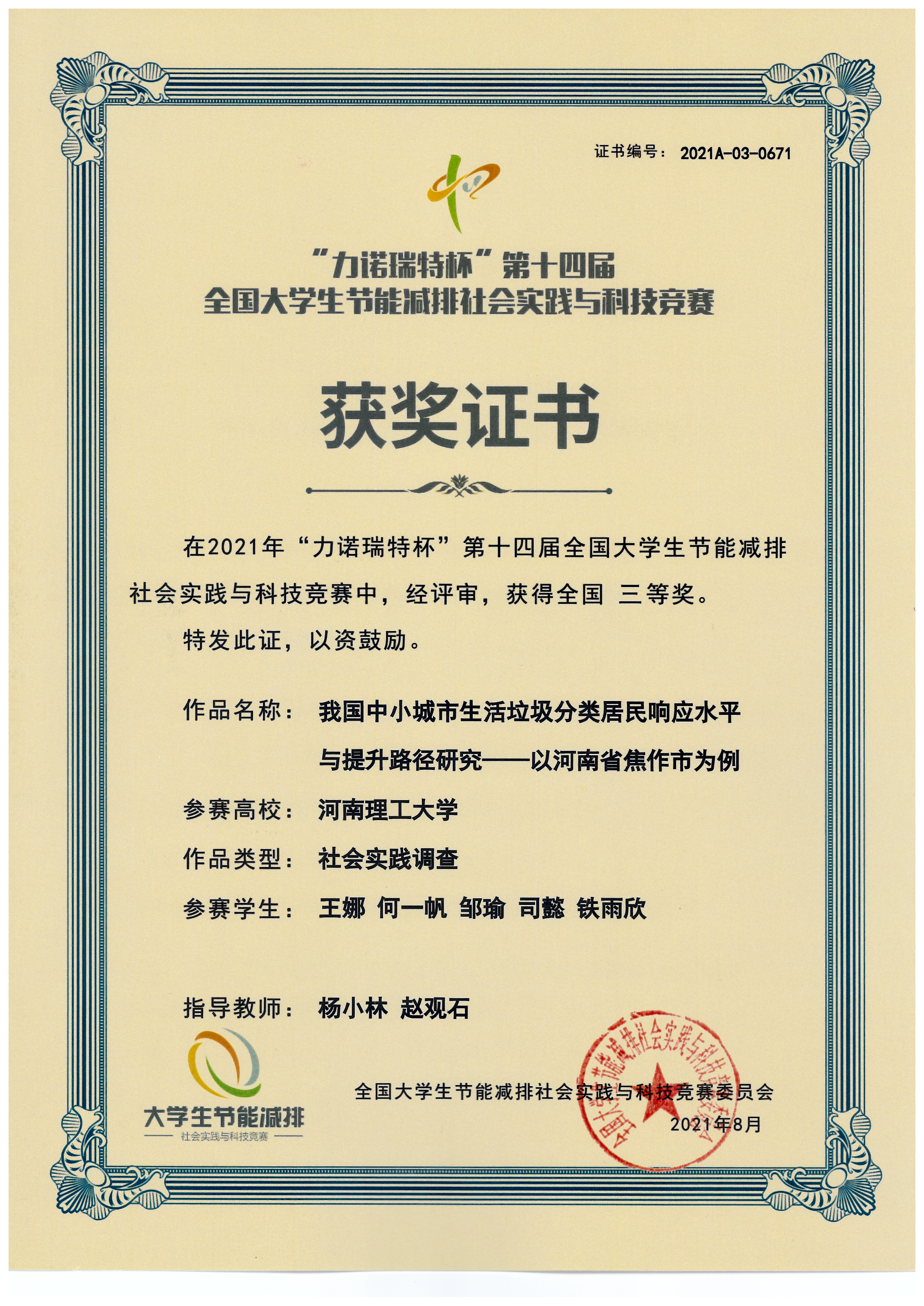 学院自去年12月启动此项赛事以来,最终由王娜、何一帆、邹瑜、铁雨欣、司懿5名同学组成的队伍进入校赛、挺进国赛,在杨小林、赵观石两位老师的悉心指导下,经过网络评议、专家会评、实物展示、答辩、合议评审等环节,公司参赛队获全国三等奖。此次获奖是对公司开展创新实践教学和员工工作的肯定,反映了公司员工积极创新和培养科学思维的意识,有利于激发本专业及相近专业员工的学习兴趣与学习积极性。