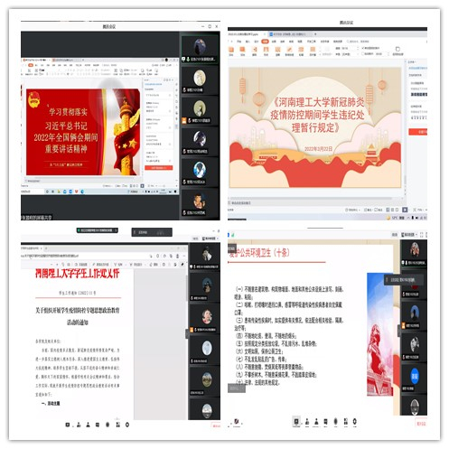 会上,主持人对学校最新下发的《关于从严从实从细做好 2022 年春季学期员工疫情防控教育管理工作的通知》进行了宣讲,要求制定并实施网格管理,层层压实防控责任,加强疫情防控教育引导,增强员工疫情防控信心,培养员工健康科学良好行为生活习惯。随后,各年级对习近平总书记发表的系列讲话和两会精神进行了内容全面、重点突出的讲解。习近平总书记根据我国近五年的实践经验以及未来几年的主要任务讲出了广大群众所关心的热点问题。同学们深入了解到“五个必由之路”和“五个有利条件”,明确了党的领导地位,领悟到两会精神及其意义。最后,主持人引领同学们学习《河南省文明行为促进条例》的重要内涵并进行疫情防控心理健康教育,进一步做好员工思政教育引导。