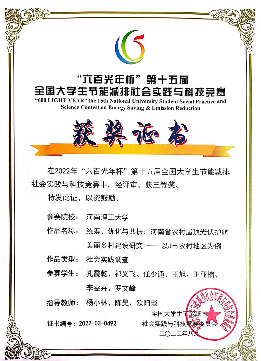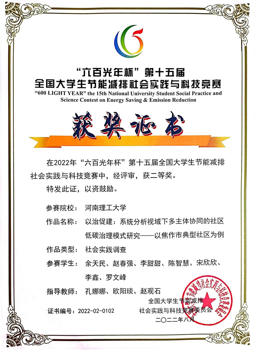 公司自启动此赛事以来,共有五支队伍进入校级决赛,并遴选出两支队伍挺进国赛。在国赛中,经过网络评议、专家会评、实物展示、答辩、合议评审等环节,最终由孔娜娜等三位老师共同指导、余天民等七位同学协同完成的作品《以治促建:系统分析视域下多主体协同的社区低碳治理模式研究——以焦作市典型社区为例》获得国家二等奖,由杨小林等三位老师联合指导、孔震乾等7名同学齐力完成的作品《统筹、优化与共振:河南省农村屋顶光伏护航美丽乡村建设研究——以J市农村地区为例》获得国家三等奖。