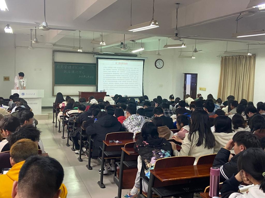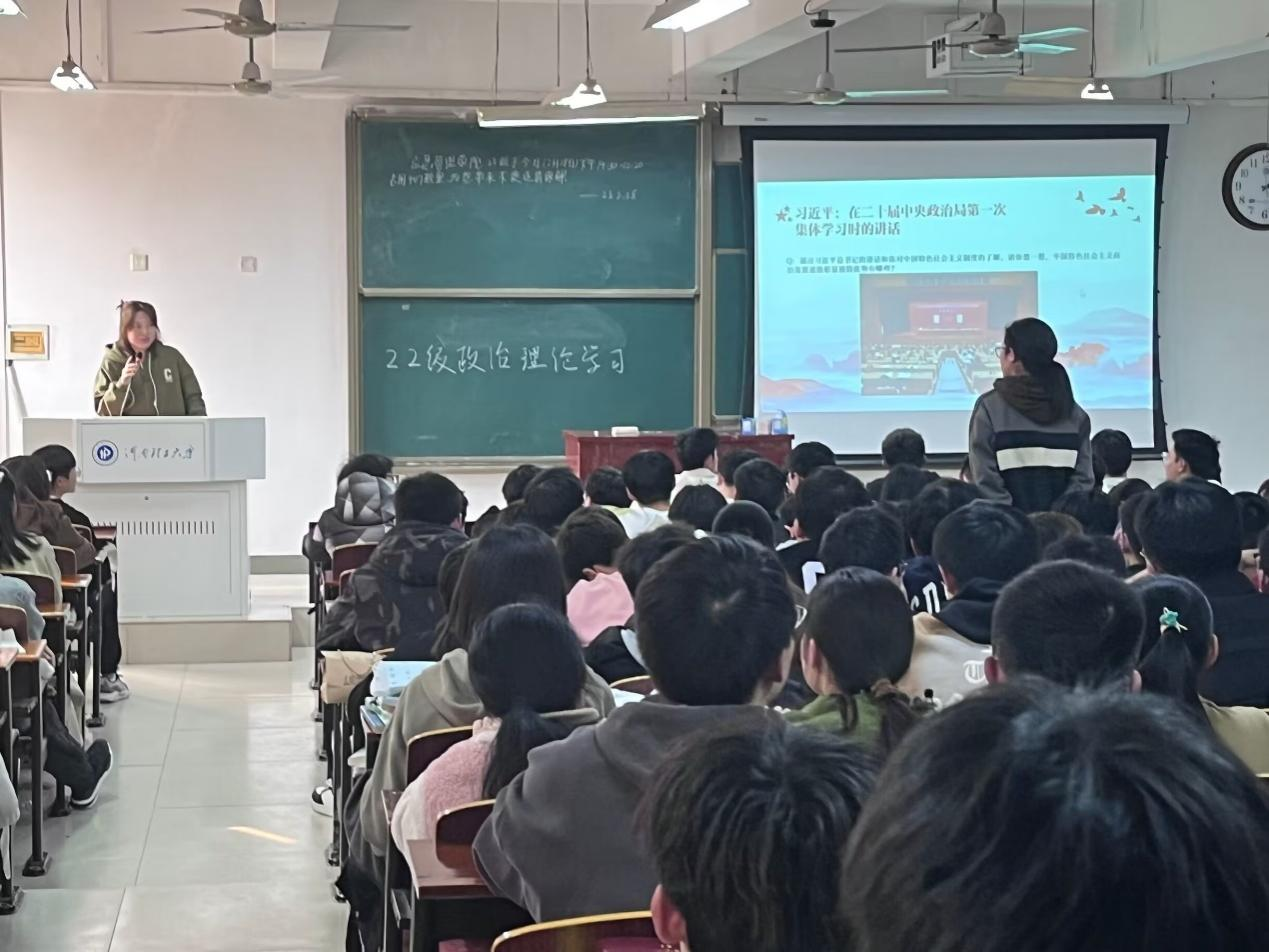 会议主体由三部分组成。一是学习习近平总书记在二十届中央政治局第一次集体学习时的讲话和在学习贯彻党的二十大精神研讨班开班式上重要讲话。会议从习近平总书记的讲话内容入手,为大家深入分析了讲话精神,阐述“两个结合”、“六个必须坚持”,旨在深刻领悟党的二十大关于党和国家事业发展大政方针和战略部署的历史逻辑、理论逻辑、实践逻辑。二是着重理解中国未来长远的发展道路以及推进中国式现代化的方向,进一步加深对中国式现代化的一系列重大理论和实践问题的认识。三是学习习近平总书记视察安阳的重要讲话精神和对红旗渠精神的重要论述,体悟“自力更生、艰苦创业、团结协作、无私奉献”的红旗渠精神,学有所用,学有所为,倡导同学们要秉承红旗渠精神价值真谛,树立正确的世界观人生观价值观。
