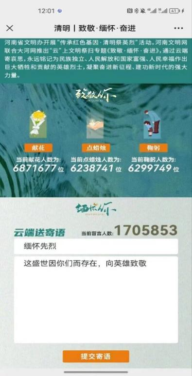 本次活动以线上形式开展,学院师生通过登录“河南文明网”参与《致敬·缅怀·奋进》线上文明祭扫专题活动。活动的祭奠方式主要有向先烈鞠躬,为先烈送花,为先烈点蜡烛等,同时还可以抒写感言向先烈表达哀思。一次次诚挚的致敬、一句句感人肺腑的留言,表达着公司员工向为国家和民族付出毕生心血的革命先烈、人民楷模致以的崇高敬意,传达出对英烈们的浓浓哀思。