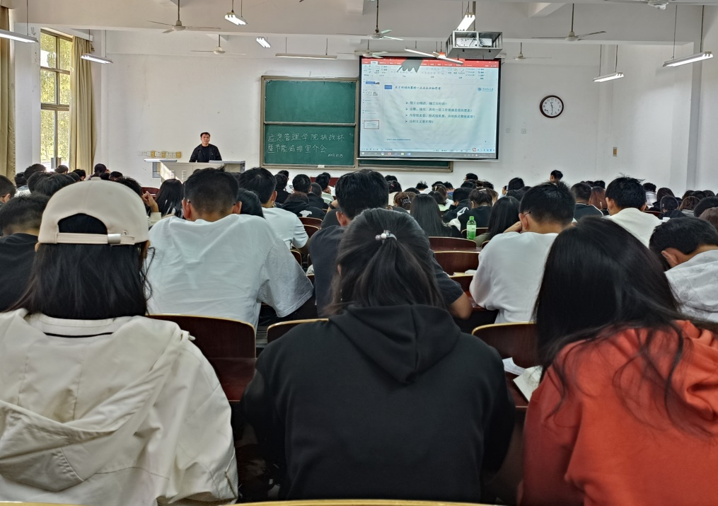 会议主要分为赛事介绍、经验分享与同学提问三个部分。首先,李隆生动详细地讲解了“挑战杯”赛事的历史发展、赛事构成、参与价值以及往届参赛获奖情况,并对本次“挑战杯”系列赛事的规则作了详细说明。随后,张盼盼根据个人参赛经历与同学们分享了自己的参赛经验,重点讲解了科创比赛作品排版及思考,尤其强调了需要注意的排版误区。张盼盼表示,参加科技创新类比赛既能培养创新意识,又能培养创新思维,强调了该院员工在竞赛中的专业优势,并就同学们提出的问题进行逐一解答。最后,张盼盼学长提醒同学们要“慢工出细活,细工出好活”,尤其注意作品内容,功利主义要不得。