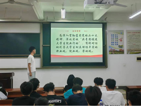 活动伊始,每班的主讲人进行介绍与宣传,同学们积极参与发言讨论,通过PPT讲解、观看视频、个人讲解、小组讨论的形式来进行主题宣传。深入贯彻落实党的二十大精神,引导老员工立足实际、找准定位,树立理性、平实的择业观、就业观,主动到基层一线“自找苦吃”、踏实奋斗、成长成才。然后,现场进行答辩环节,评委就参赛团支部的申报表、策划书、总结书和现场表现进行点评指导,指出优缺点并提出修改建议。最后,同学们在活跃的氛围中了解深入此次班会的核心思想。不少同学表示对自己有了更为清晰的职业规划,开始客观看待个人条件和社会需求,从实际出发,选择职业和工作岗位。