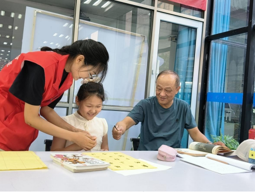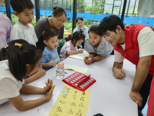 活动伊始,队员们以讲解和问答结合的方式向孩子们阐述了流行病预防和电梯事故处理的相关知识,极大地调动了孩子们参与和学习的积极性,丰富了孩子们面对突发事件的应急安全储备知识。活动进行的过程中吸引了许多儿童的围观和学习,营造了“人人讲安全,个个会应急”的良好学习氛围。在弘扬优秀传统文化方面,队员们细致讲解了汉字发展历程和著名书法作品,孩子们沉浸于中华书法文化的深厚底蕴和悠远历史中,深切体会到了中华文化博大精深,千年传承。在操作环节,队员与孩子们共执毛笔,感受书法的深邃魅力,在墨香中激起孩子们对传统文化的兴趣,精心实践,传承书法技艺。队员们通过开展“翻格子,记成语”的游戏活动,分享提高记忆力的技巧,引导孩子们形成科学高效的记忆方法。